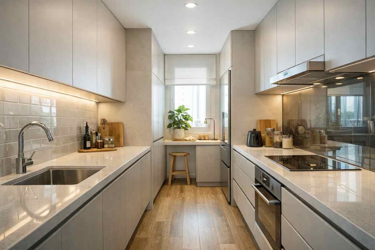 Una cucina stretta può risultare addirittura più efficiente di una cucina con isola, perché riduce al minimo gli spostamenti e concentra le funzioni. Ma deve essere progettata con rigore.