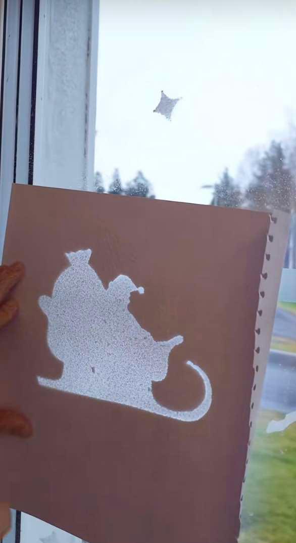 Con una bomboletta spray distribuisci la neve artificiale attorno alle sagome. Puoi decidere se creare un effetto leggero e sfumato oppure più intenso. Una volta sollevati gli stencil, appariranno le figure perfette e nitide.