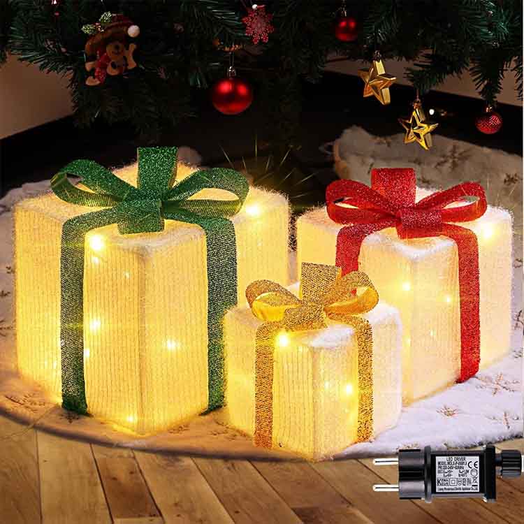Le scatole regalo illuminate funzionano con la presa elettrica con trasformatore a bassa tensione, e hanno 3 dimensioni diverse: 25.5 cm, 20.5 cm e 15.5 cm. Tutte e tre sono vendute insieme, e hanno ben 8 modalità di illuminazione.