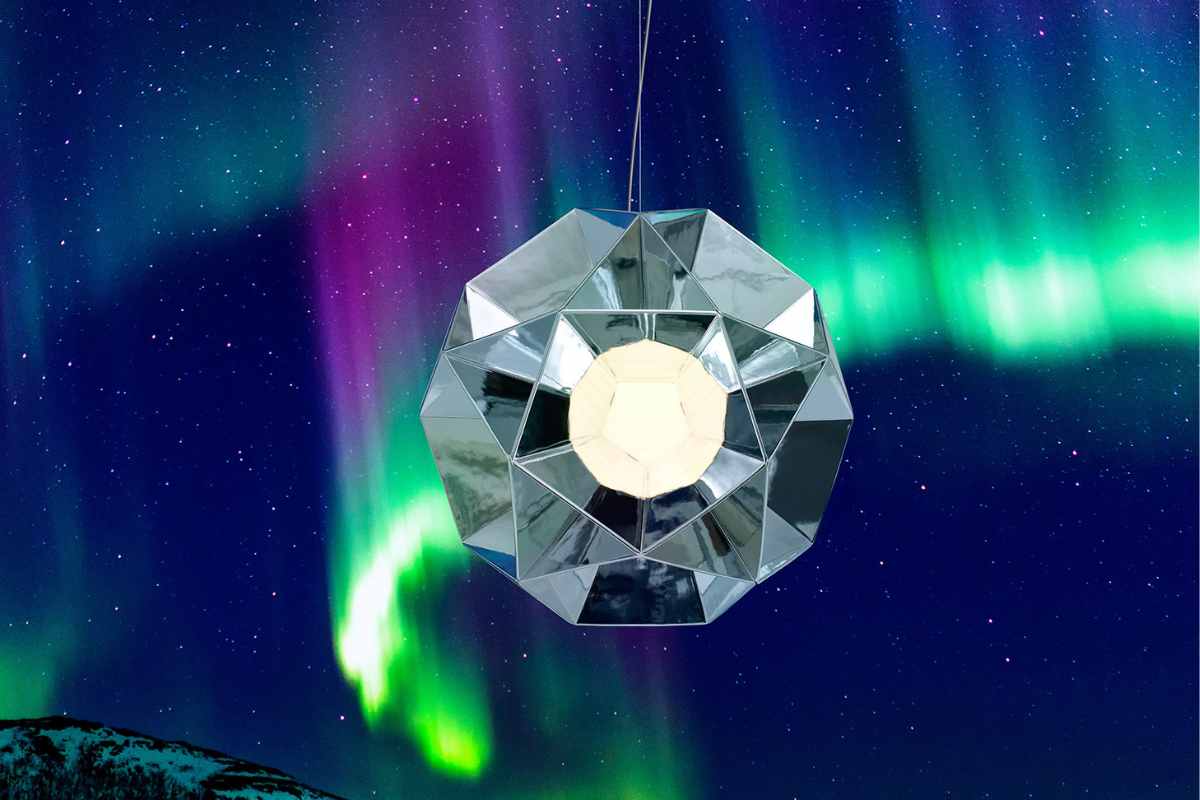 Una lampada dalla superficie a specchio e dalla forma che ricorda un solido con lati pentagonali che si irradiano dal centro dove si mostra una sfera diffusore. La luce che si moltiplica e si riflette fa di questo complemento di arredo un oggetto che è molto più di un generatore di luce. La famiglia Arctic comprende lampada a sospensione, lampada da soffitto, lampada da tavolo e lampada da terra.