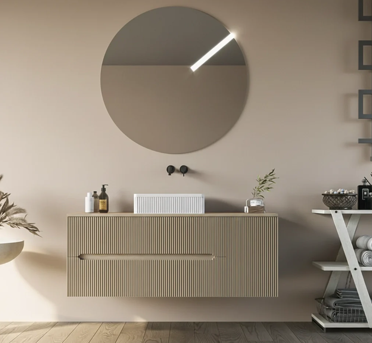 Ogni finitura dialoga con specchi, illuminazione LED e accessori, creando un insieme coerente e raffinato.