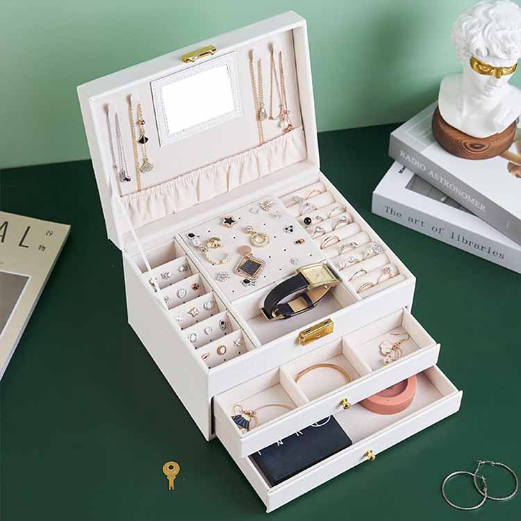 Questo portagioie in particolare oltre a essere dotato di una grande capacità disposta su 3 livelli (di cui 2 cassetti), ha un design elegante di fascia alta in pelle e metallo di alta qualità. In dotazione ci sono anche 15 sacchetti trasparenti per gioielli e 3 panni per lucidare l’argento.