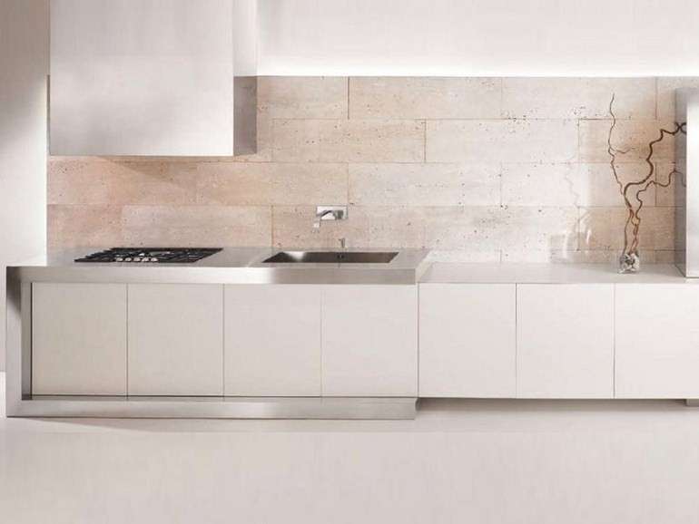 TM Italia Cucine e il modello Petra: cucina in travertino con isola a scomparsa.