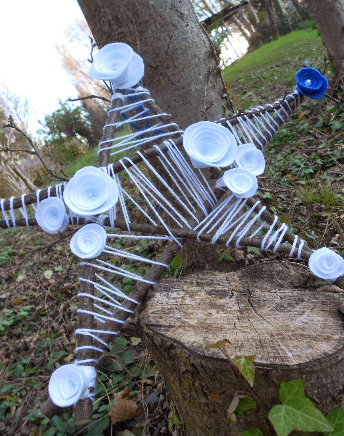 Come decorare con i rami secchi una ghirlanda nelle tinte del bianco.